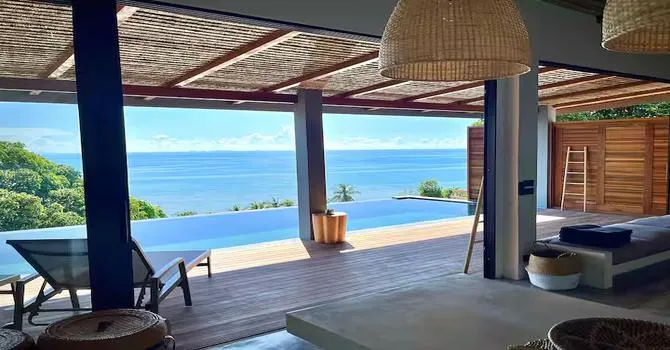 The villa's design is both simple and elegant, with open living rooms that lead to the terrace and the stunning sea views beyond. The clean lines and neutral colors of the modern Thai design are brought out by the natural light that fills the space. The big living room leads to a modern, fully equipped kitchen with a polished concrete island. This is a great place to have dinner and watch the sun set.